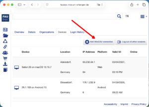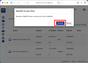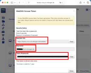 Now You can see the WebDAV URL, the FAUbox username and the WebDAV token needed for authentication to the WebDAV service. Don’t worry abouot the sometimes strange look of the username. This is delivered by your SSO identity provider.