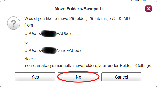 Be careful to include the FAUbox basefolder in the path since it could lead to loss of data! - Respond to the question to move the folders with “NO”.