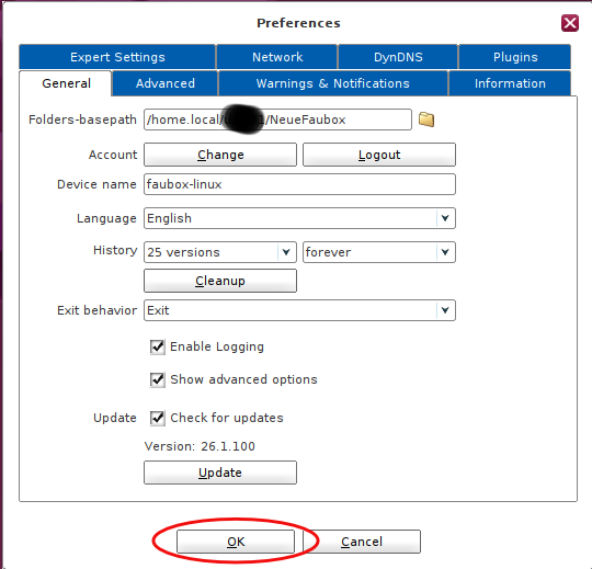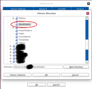 - A change of the folders base path in the FAUbox client settings will affect new folder, only. Existing folders will not touched.